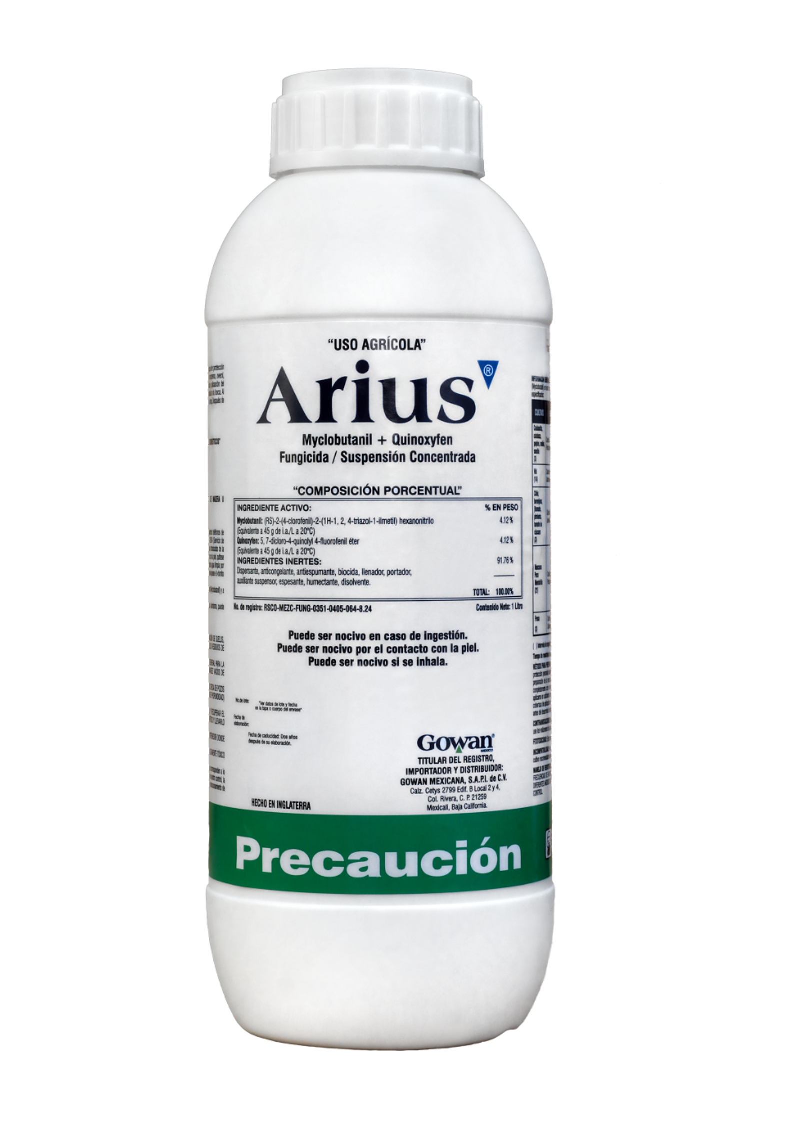 Arius es un fungicida de acción preventivo curativo para el control de cenicillas en solanáceas, cucurbitáceas, vid, entre otros. Está compuesto por dos ingredientes activos muy potentes de diferente grupo químico en el manejo de cenicillas quinoxyfen y myclobutanil. Ofrece amplia protección durante todo el proceso de infección de cenicillas