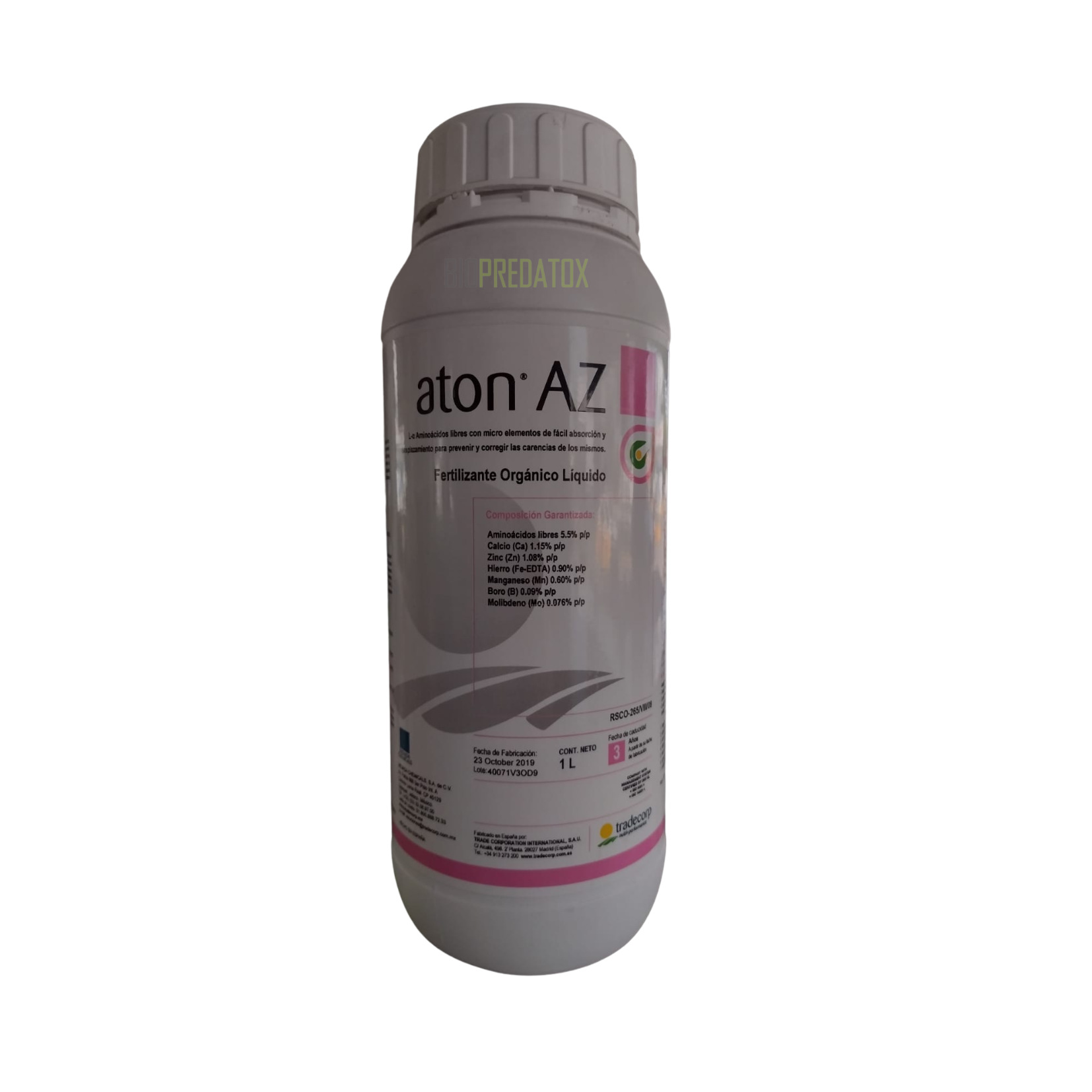 Aton az fertilizante orgánico líquido de fácil asimilación, con l α aminoácidos libres, calcio, zinc, hierro, manganeso, boro y molibdeno, recomendado para corregir y prevenir deficiencias de los nutrientes en su composición, con efecto ahorro de energía.
