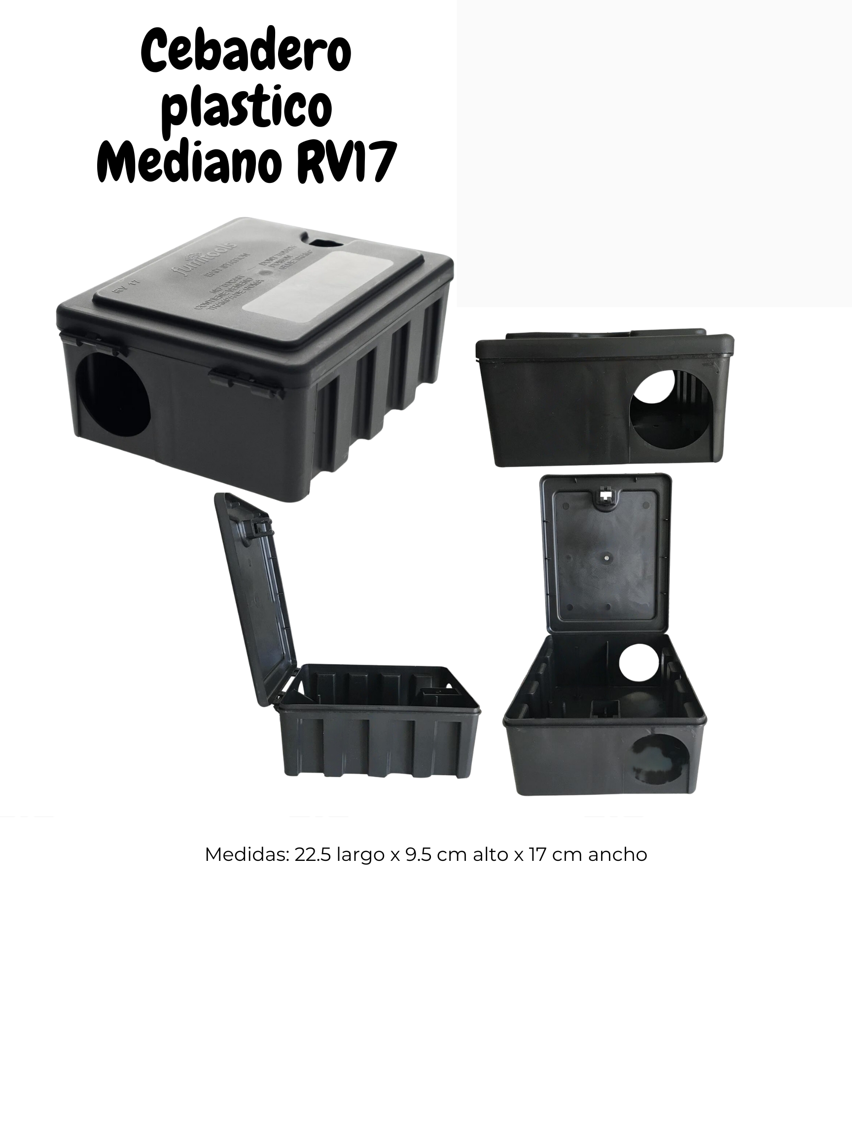 Cebadero plastico mediano rv17 cebadero para raticidas fabricada de polipropileno de alta densidad con antioxidantes y aditivos uv para la protección contra las radiaciones solares y el envejecimiento. Esta compuesta de un cajón, una tapa, dos barras de acero inoxidable y una llave.
