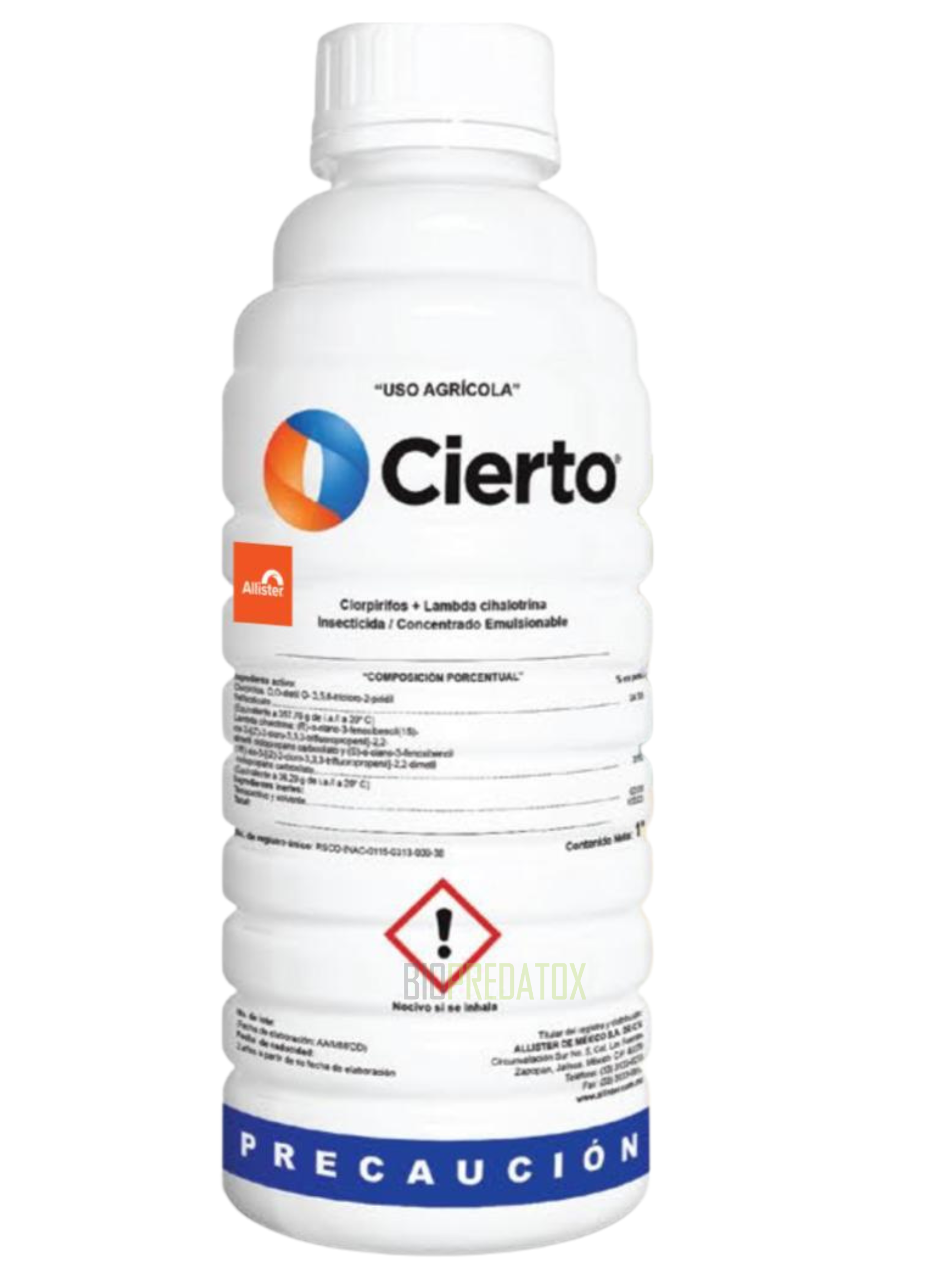 Cierto es un insecticida a base de clorpirifos + lambda cihalotrina que actúa por contacto. Se recomienda su uso para el control de las plagas en los cultivos
