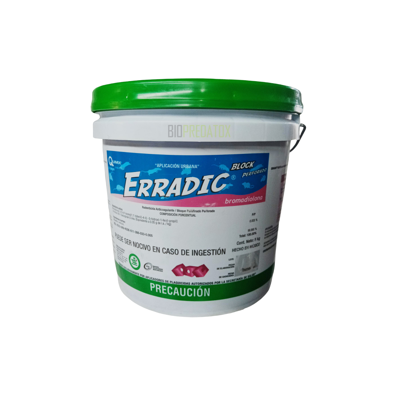 Erradic block parafinado perforado es un rodenticida anticoagulante de segunda generación, de una sola dosis elimina ratas, ratones y otras especies de roedores en el ámbito urbano