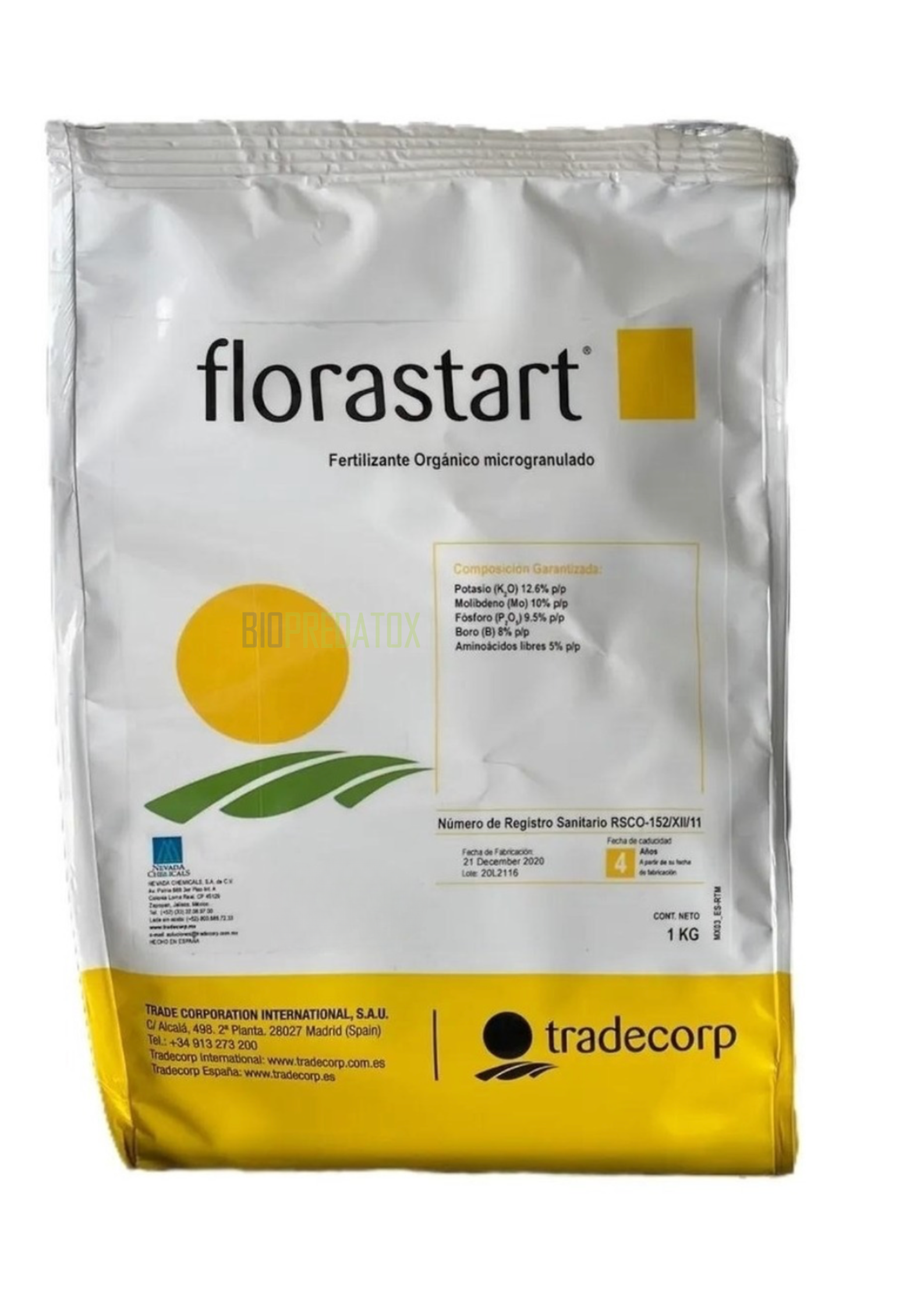 Florastart fertilizante que contiene en su formulación l α aminoácidos libres, fósforo, potasio, boro y molibdeno, nutrientes que participan en la floración y cuajado de frutos, favorece la floración y el amarre de frutos incrementando la calidad y el rendimiento.