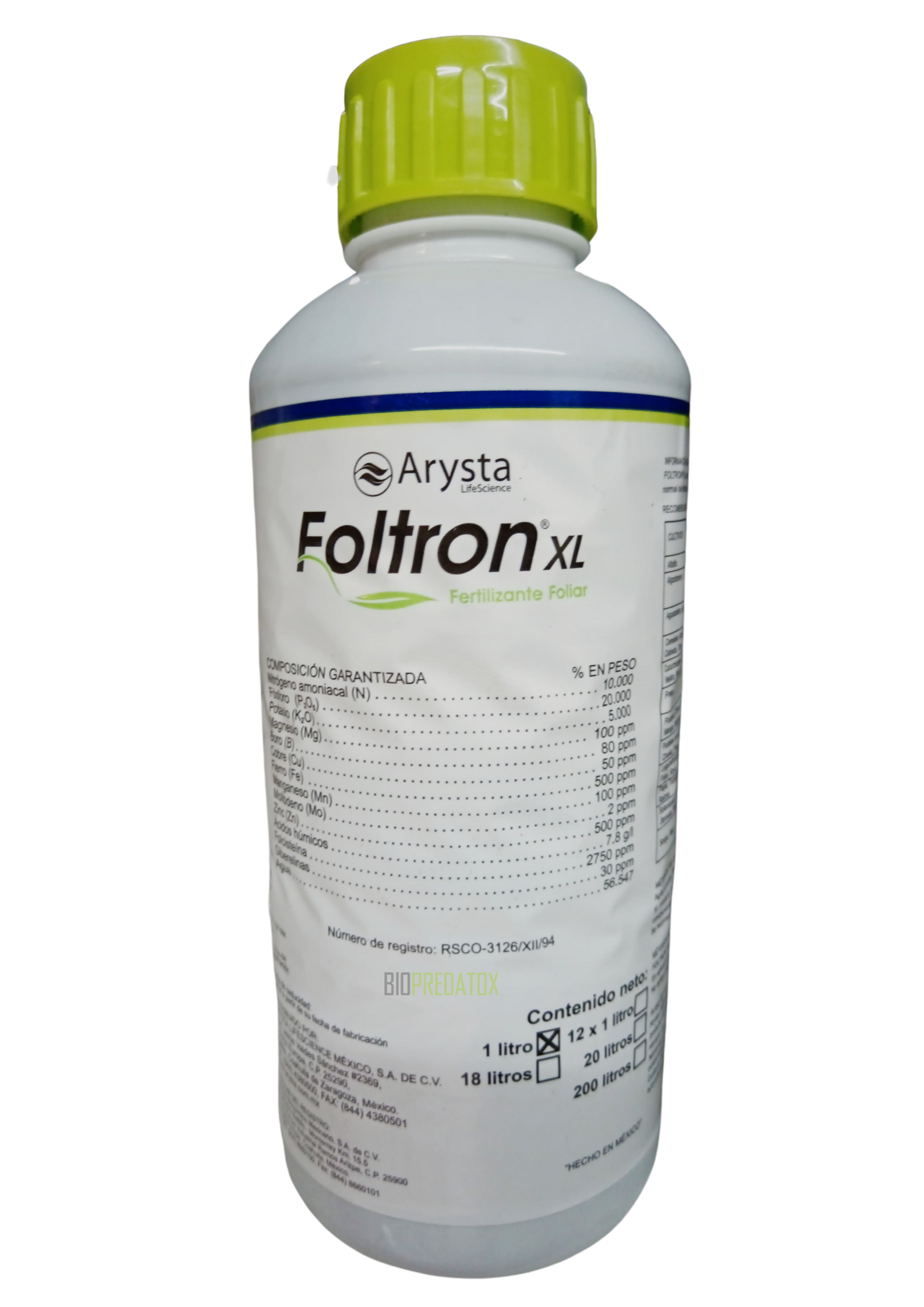 Foltron xl es un fertilizante orgánico elaborado con una mezcla de macro y micro nutrientes, enriquecidos con folcisteína, para aplicarse en crecimiento vegetativo y bajo condiciones de estrés de la planta. Foltron xl garantiza una máxima absorción del producto al ser aplicado al follaje. Foltron xl aporta macro y micro elementos necesarios para corregir deficiencias nutrimentales, mientras que la folcisteína, un derivado de aminoácidos, es usada como bioestimulante para generar reservas bioquímicas para resistir periodos críticos causados por estrés abiótico;