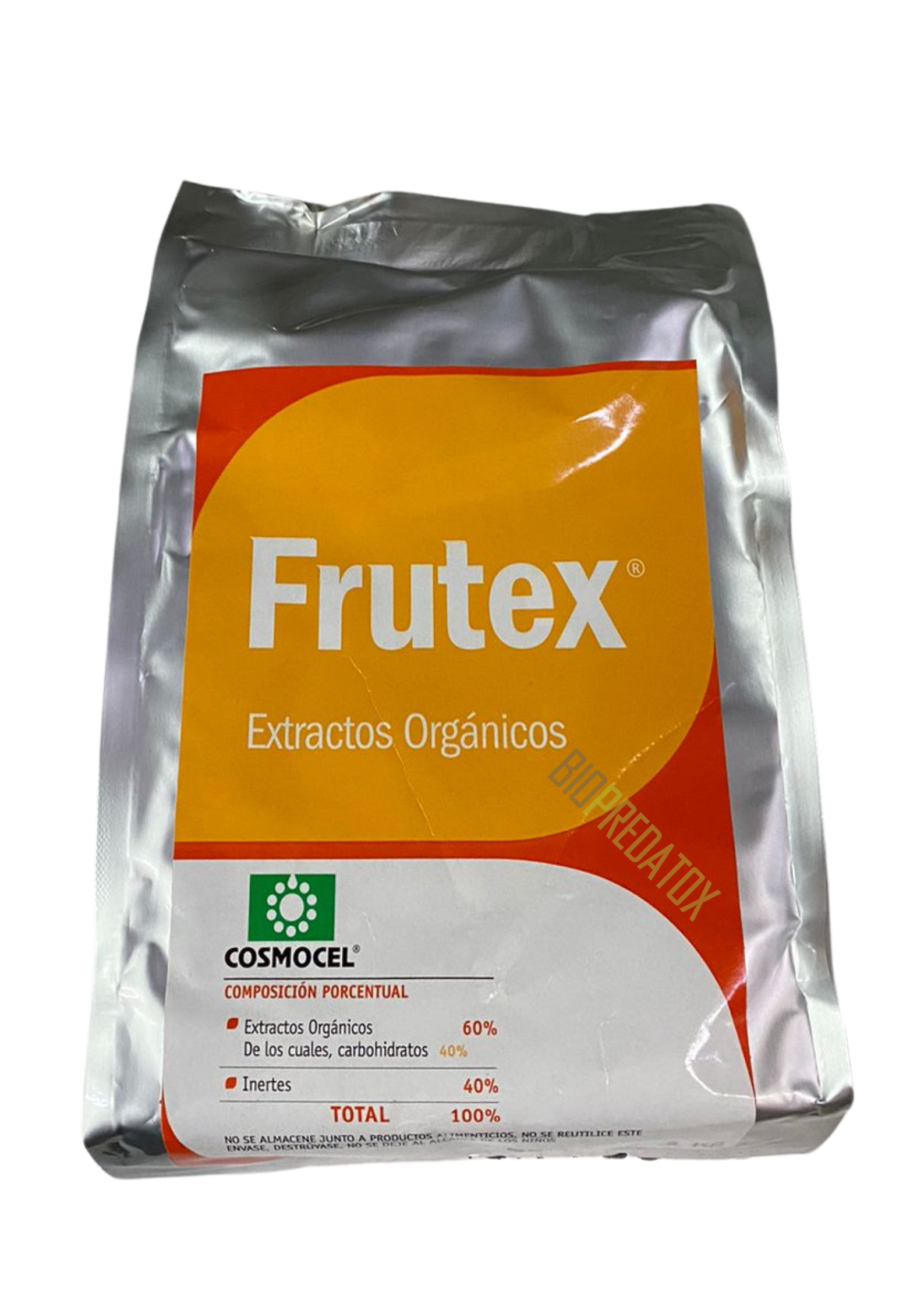 Frutex promotor de la fructificación en forma de polvo soluble. Formulado con base en carbohidratos y otros compuestos orgánicos, cuya finalidad es mejorar las condiciones de la planta durante la etapa de fructificación para generar un fruto de mayor calidad, particularmente sobre aumento en tamaño. Para tratamiento exclusivamente al suelo y su aplicación debe dirigirse a las etapas donde se registre la más alta tasa de crecimiento en el fruto. Para una mejor respuesta en la aplicación se sugiere cuidar un adecuado manejo del riego y fertilización