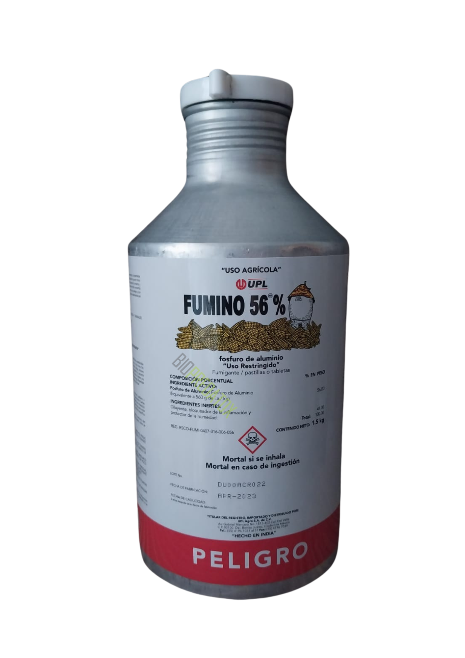 Fumigante agrícola a base de fósfuro de aluminio, para el control de barrenador, carcoma, gorgojo, palomilla, picudo, polilla en granos y semillas almacenadas de arroz, avena, cebada, frijol, garbanzo, maíz, sorgo, soya y trigo.