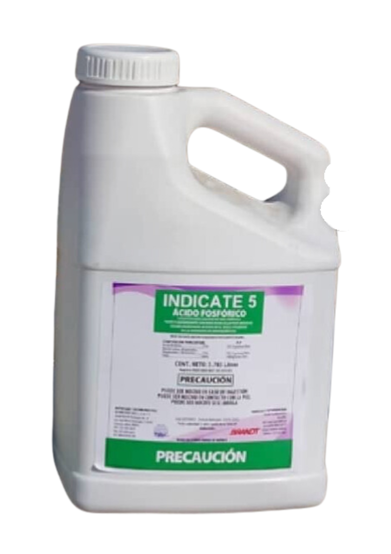 Indicate 5 es un coadyuvante que contiene la combinación de compuestos no iónicos y aniónicos necesarios para acidificar y buferizar el agua usada en aspersiones terrestres y aéreas; diseñado para ajustar el ph del agua y así maximizar la eficiencia de los productos foliares.