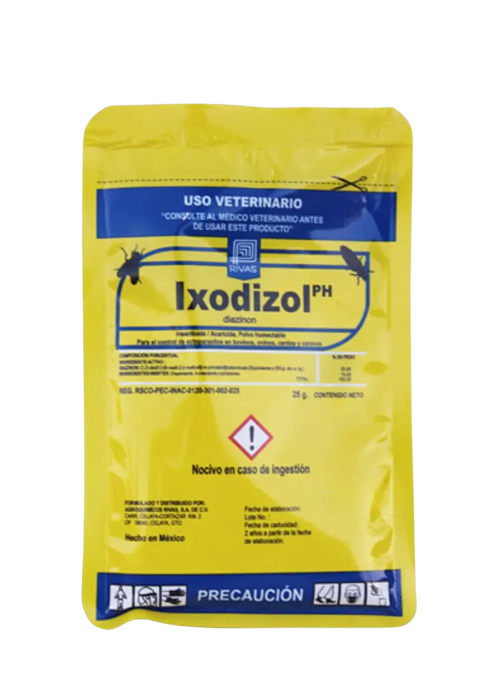 Ixodizol sarnicida, piojicida y mosquicida de prolongada acción residual para aplicarse como baño directamente en animales (bovinos, cerdos, obejas y perros) así como en establos, porquerizas, mataderos, criaderos de perros, caballerizas y otras instalaciones en que se alojen animales.