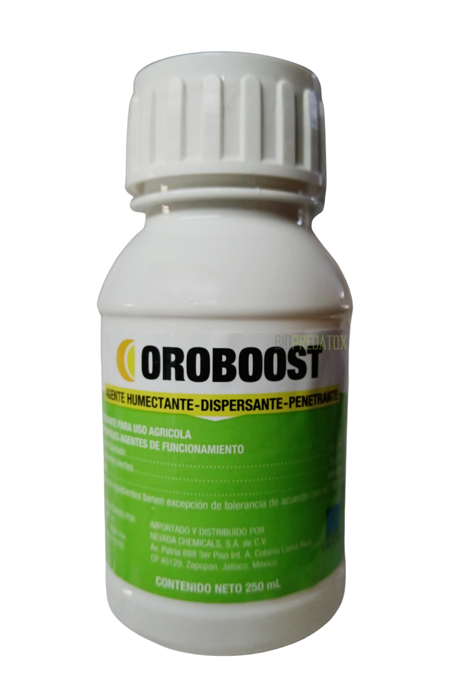 Oroboost es un insecticida, fungicida, acaricida y coadyuvante basado en una solución de aceite de cítricos y alcohol etoxilado al 13.58 % y varios agentes coadyuvantes orgánicos; estas características hacen que el producto sea biodegradable, amigable para las abejas y los depredadores y no tenga problemas con residuos.