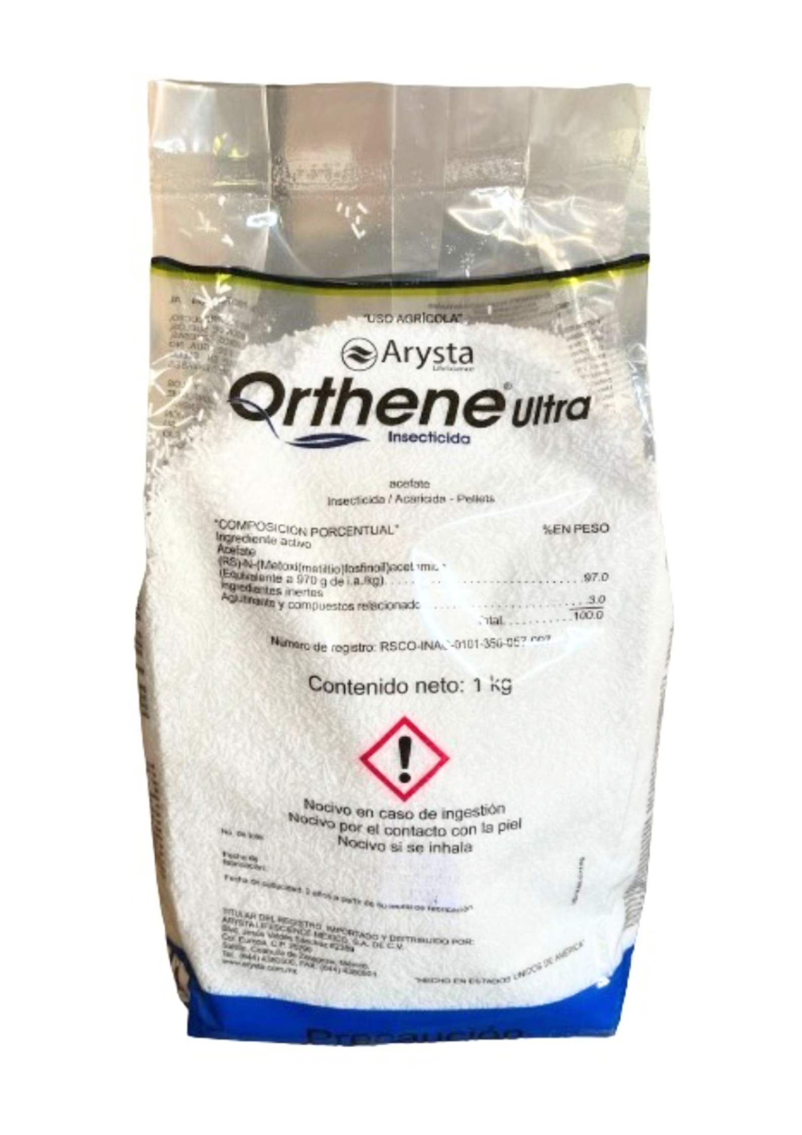 Orthene ultra es un insecticida / acaricida organofosforado sistémico de amplio espectro que actúa sobre insectos chupadores y masticadores, actúa inhibiendo la colinesterasa y afectando el sistema nervioso central.