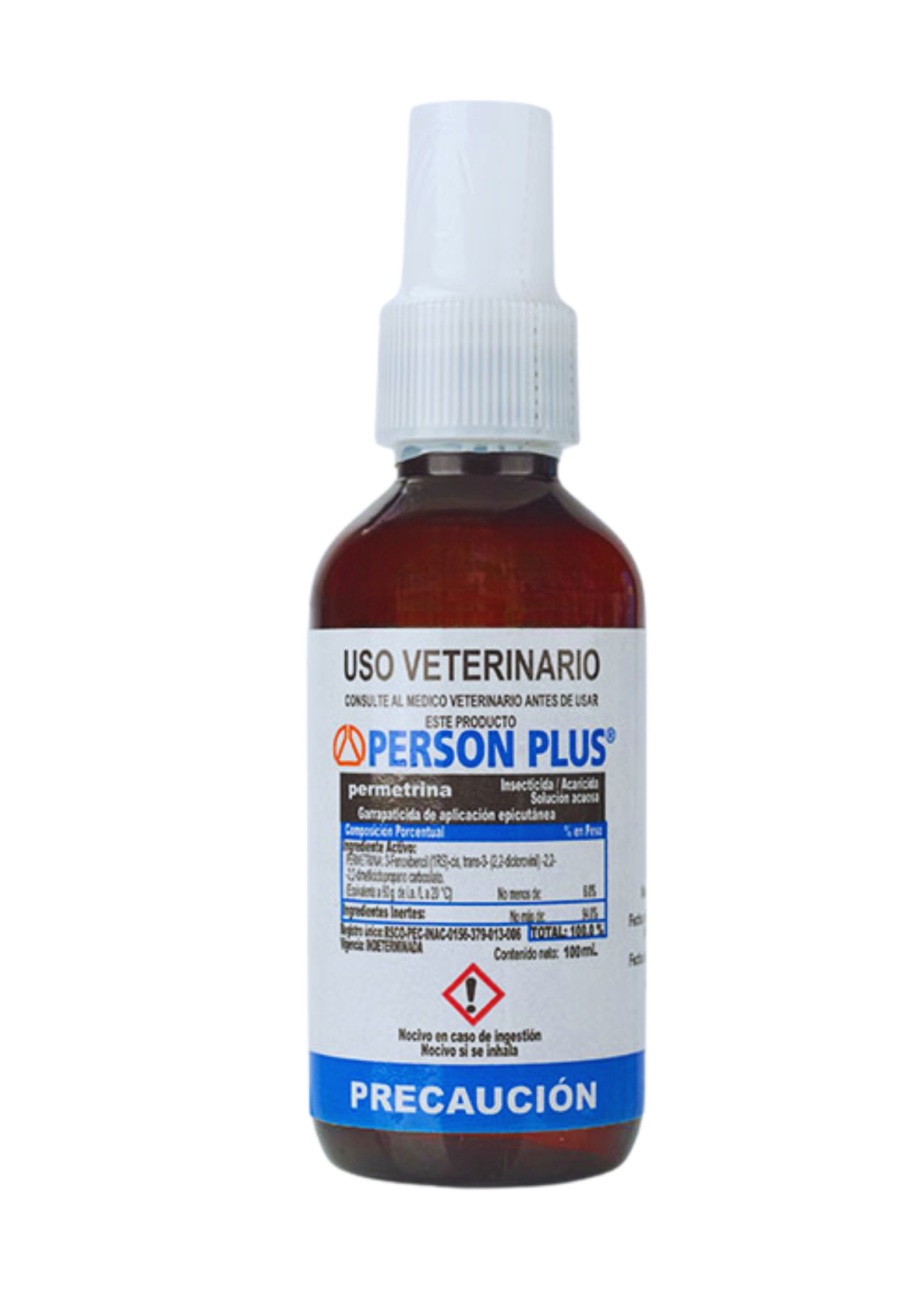 Person plus contiene un piretroide sinergizado de aplicación dérmica dorsal, con un amplio espectro contra ectoparásitos de los bovinos como: mosca del cuerno, mosca de establo, garrapatas y piojos. Contiene permetrina 6%.