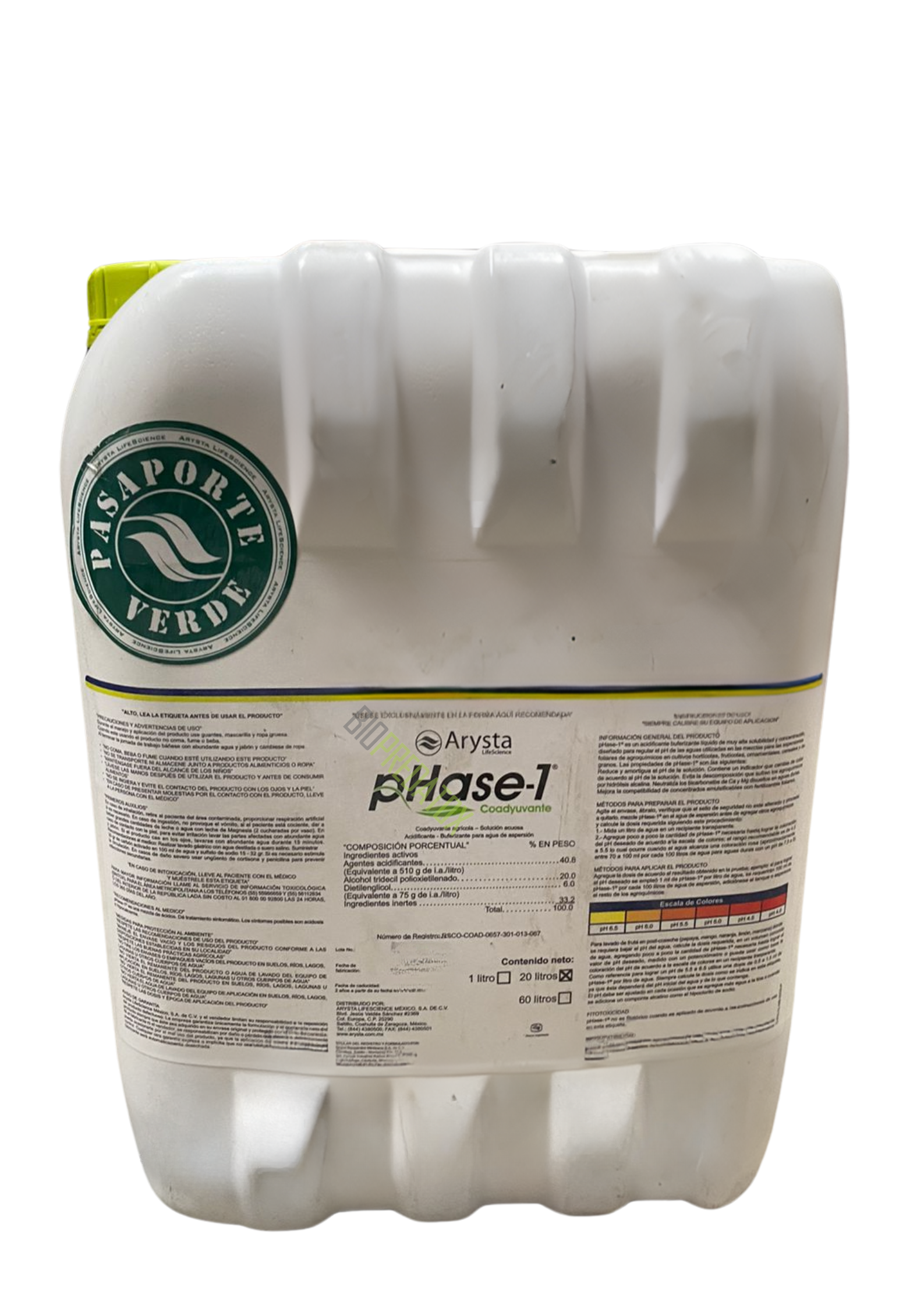 Phase coadyuvante acondicionador de agua que reduce y amortigua el ph para optimizar el uso de los productos insecticidas, herbicidas, fungicida y de nutrición que sean afectados por hidrólisis alcalina.
