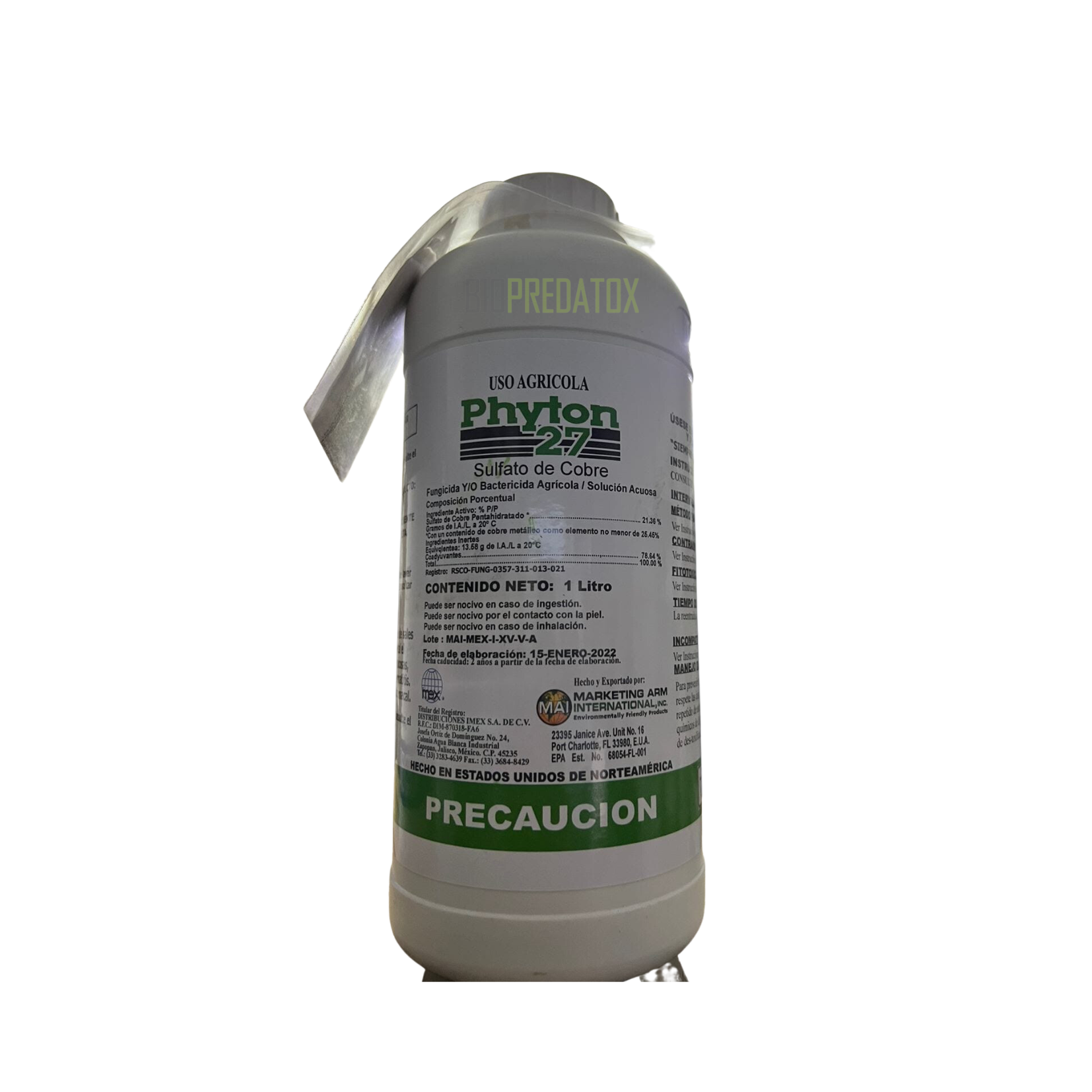 Phyton 27 es un fungicida, bactericida, de amplio espectro de acción. Previene y cura enfermedades de frutales, vides, fresas, hortalizas, cultivos tradicionales y ornamentales. Se permite su uso en cultivos orgánicos. No tiene carencia, por lo que está indicado en aplicaciones de precosecha