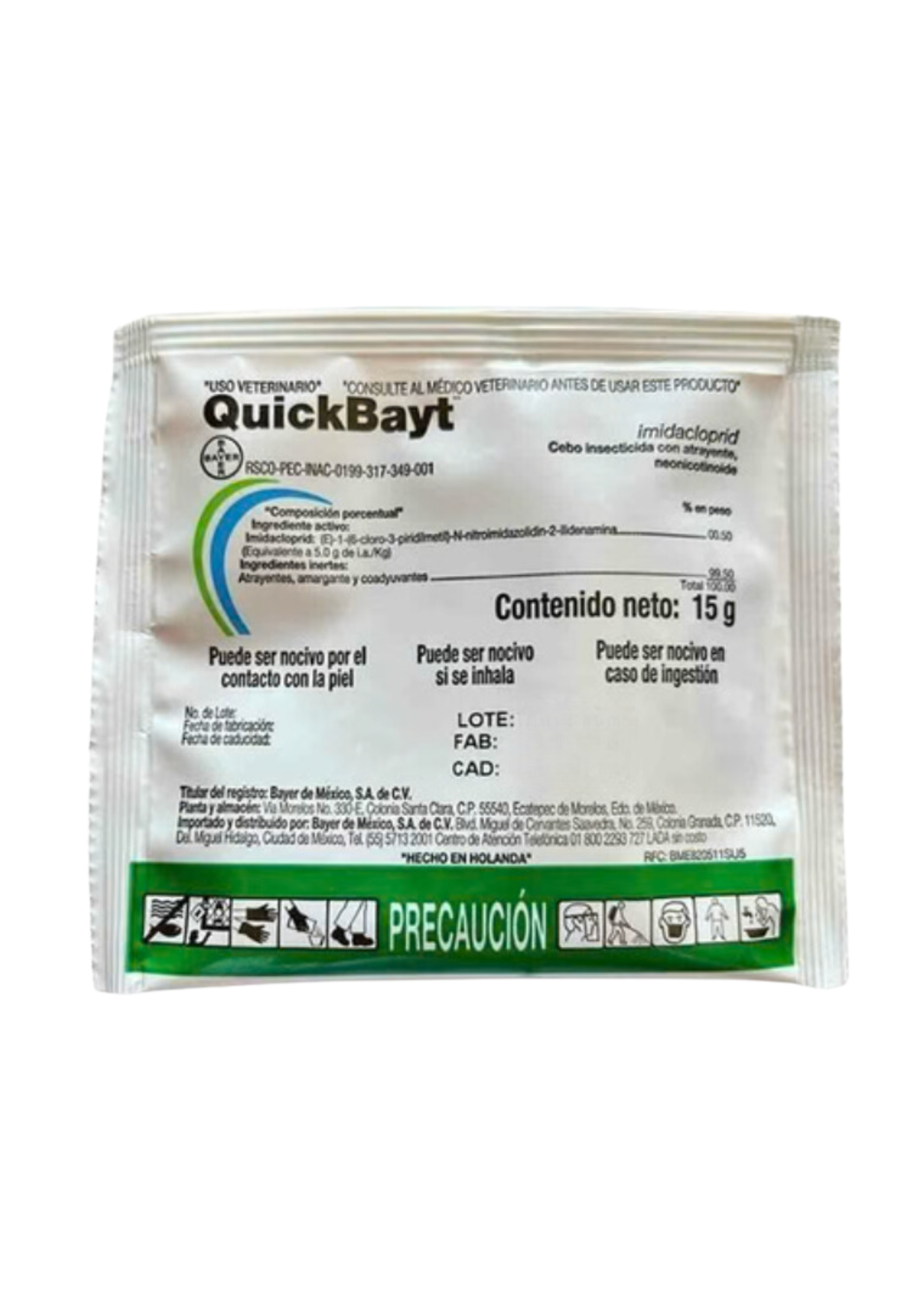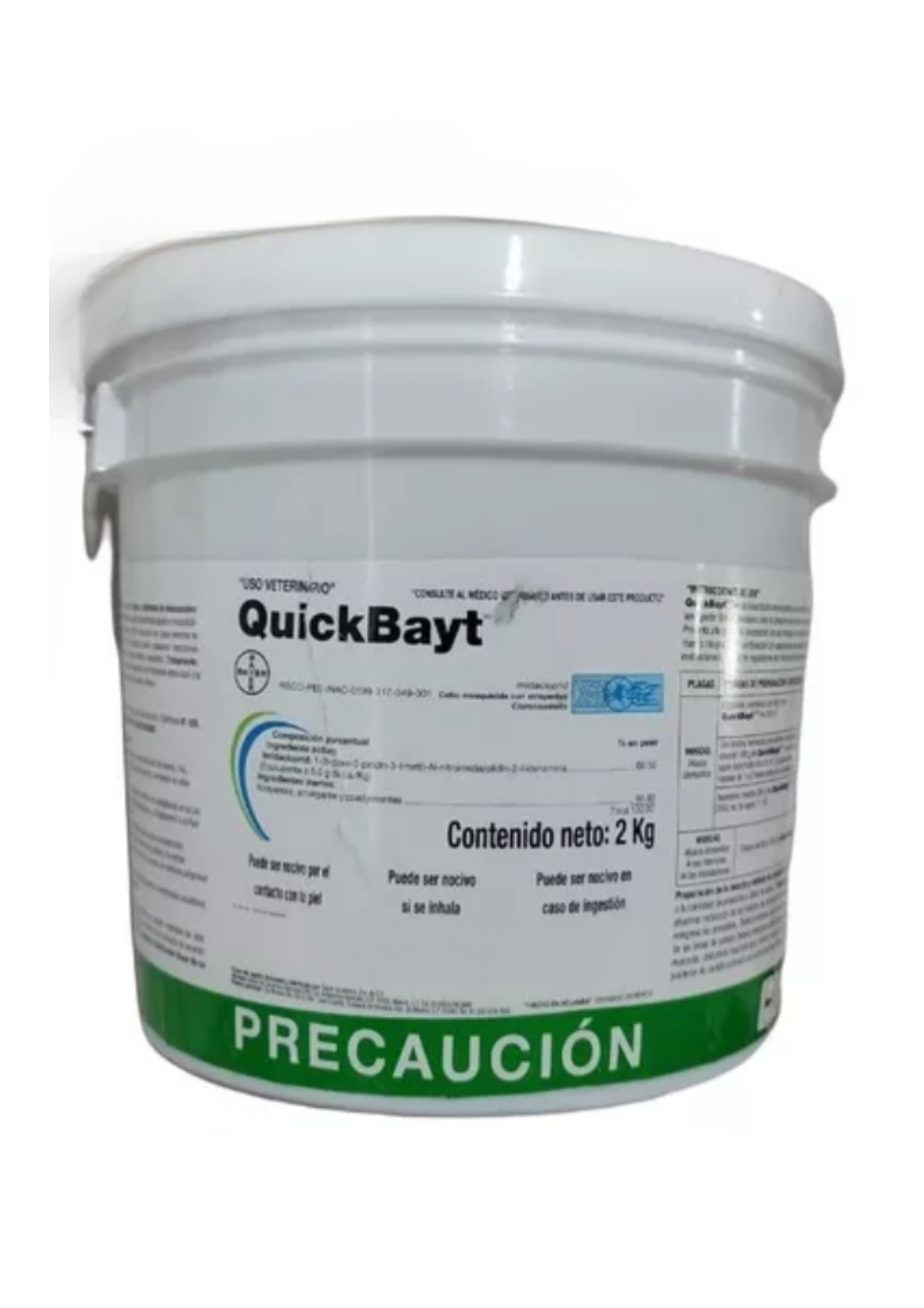 Quick bayt 15 gr elanco insecticida mosquicida contenido sustancia activa: imidacloprid: 0,5%, equivale a 5 g por kg indicaciones quick bayt es un mosquicida cloronicotínico que bloquea receptores post sinápticos de los insectos desencadenando la muerte de los mismos, aún en aquellos «resistentes» a insecticidas tradicionales. Este mecanismo de acción es altamente efectivo contra insectos y seguro para animales domésticos y el humano. Para instalaciones pecuarias, granjas, establos, cuadras, gallineros, lecherías, porquerizas, galpones, etc., exteriores e interiores. Parásitos (espectro de acción) mosca doméstica (musca domestica), pequeña mosca doméstica (fannia canicularis) y otras moscas no picadoras.
