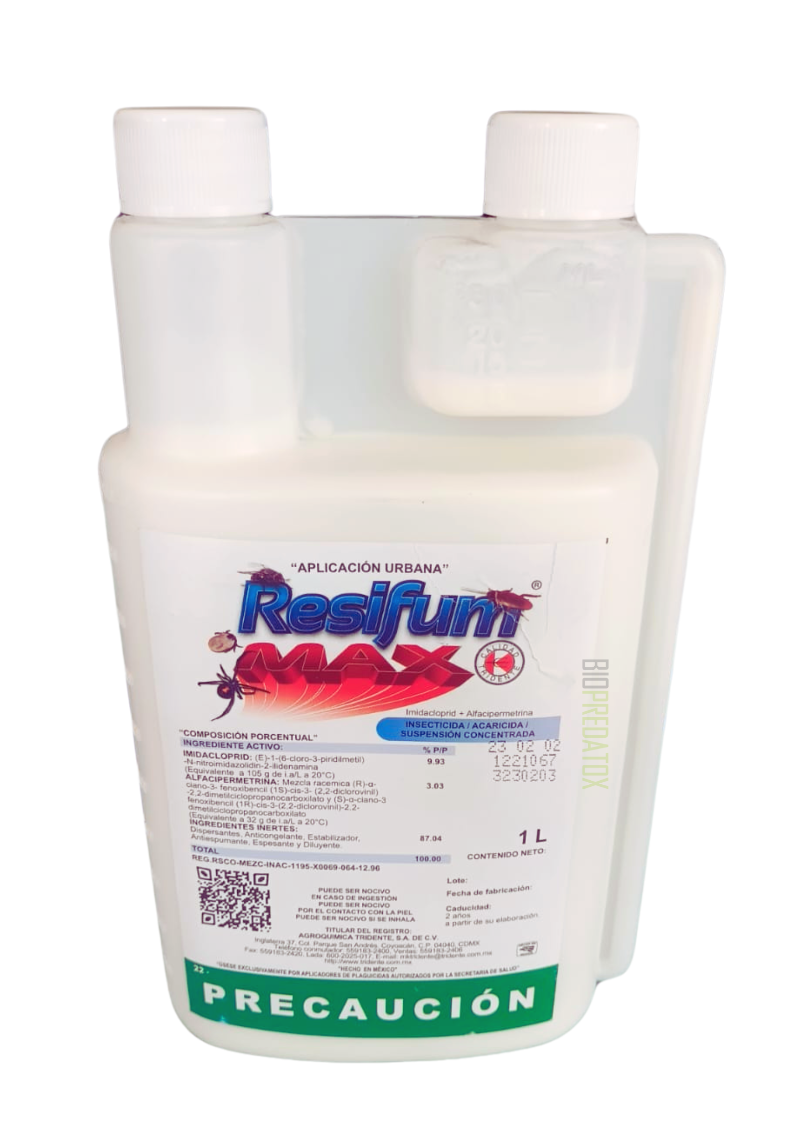 Resifum max es una mezcla de dos insecticidas, uno de la familia de los neonicotinoides (imidacloprid) y el segundo de la familia de los piretroides (alfacipermetrina). El producto se recomienda para el control de una amplia gama de artrópodos voladores y rastreros