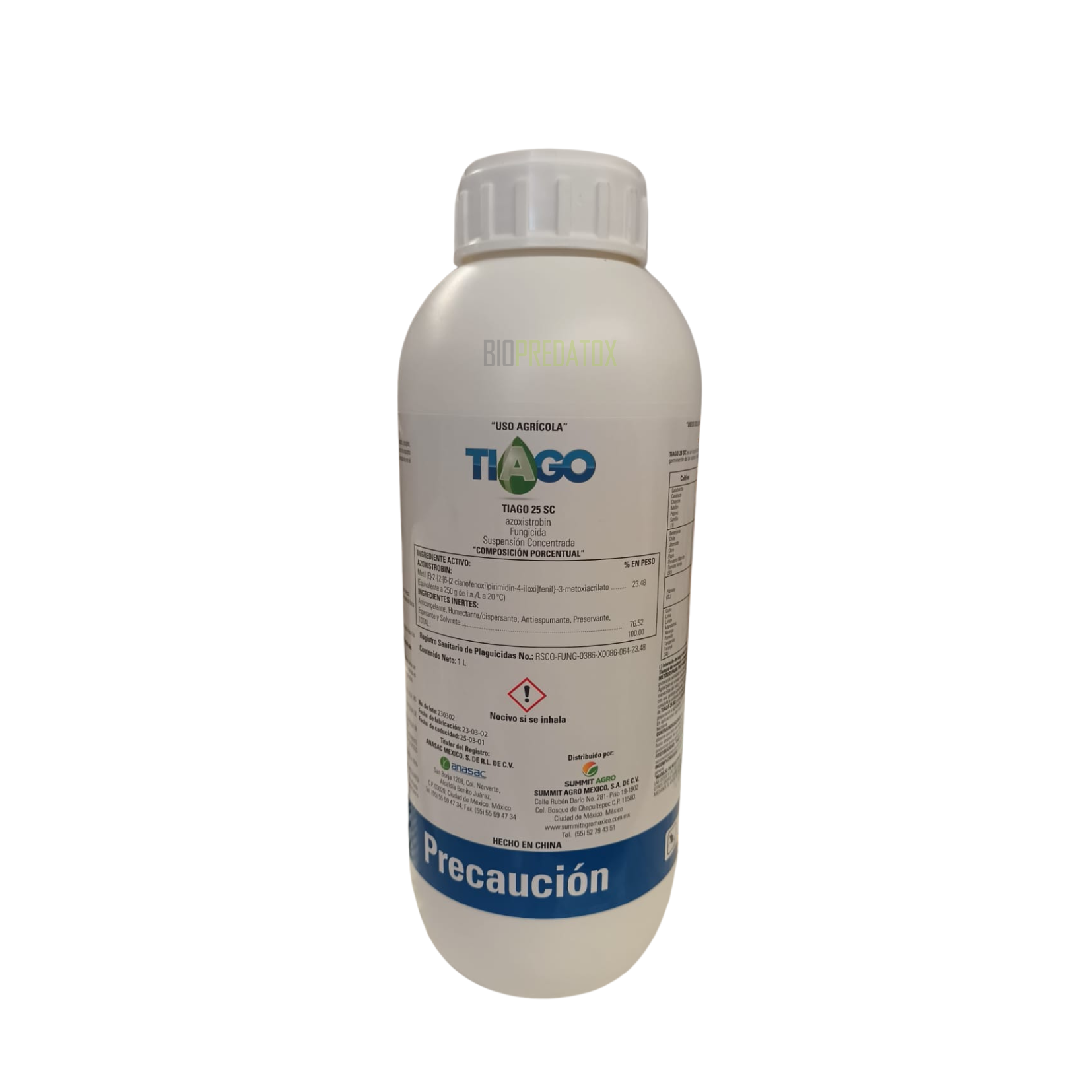 Tiago es un fungicida con acción preventiva y curativa, que corresponde al grupo de las estrobilurinas. Inhibe la germinación de las esporas y estados tempranos de desarrollo de hongos, crecimiento del micelio y la esporulación.
