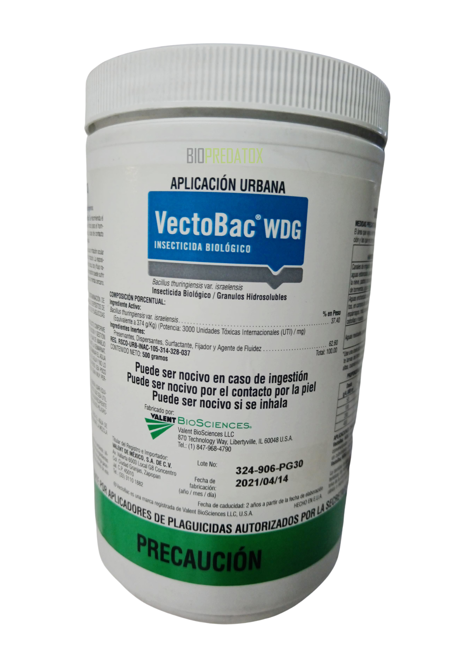 Vectobac wdg larvicida biológico a base de bacillus thuringiensis var. Israelensis en formulación de granulos solubles para el control de dípteros, se aplica en los criaderos en donde se generan las larvas de mosquitos aedes aegypti, anopheles spp. Y culex spp.